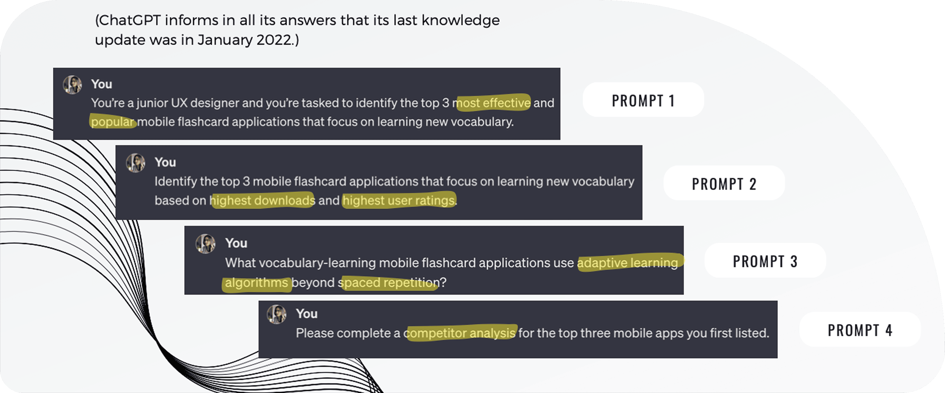 ChatGPT was most useful in gauging and supplementing my own already-formed assessments. I compared its competitor analysis with my own and found similarities as well as learning points. Its responses also helped me to look up concepts I’d overlooked, like spaced repetition and adaptive learning algorithms.