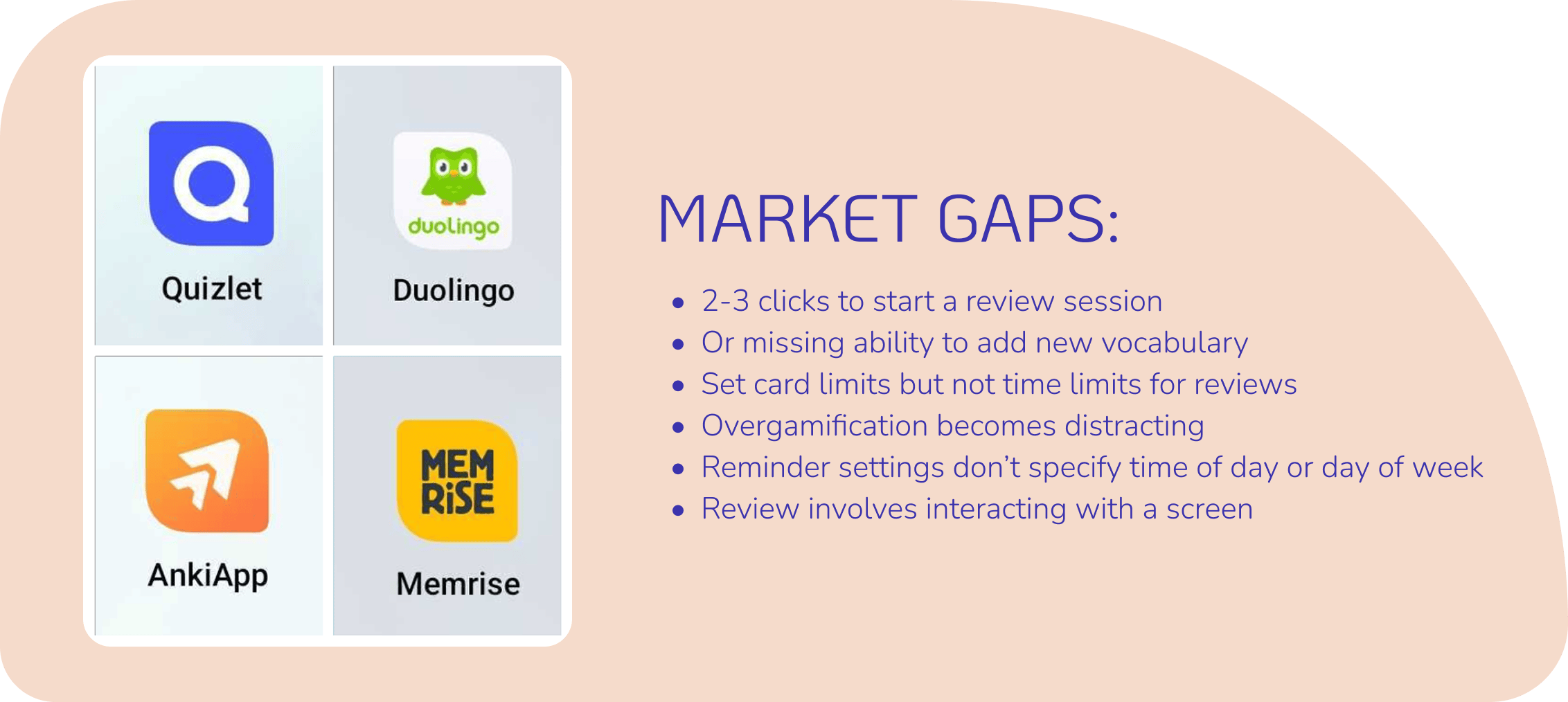 There are plenty of language-learning flashcard apps out there, but why are learners still dropping off or giving up? Get a sense of the landscape: I searched online, played with competitor apps, and combed through user ratings and comments, then turned to AI to test and gauge my findings.
