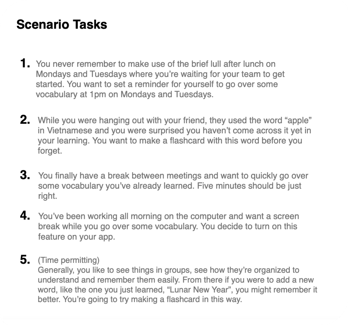 I chose to focus on the former three apps because they are most similar in form and function, but I kept Duolingo in mind for its popularity, emotional design, and gamified approach to vocabulary learning.