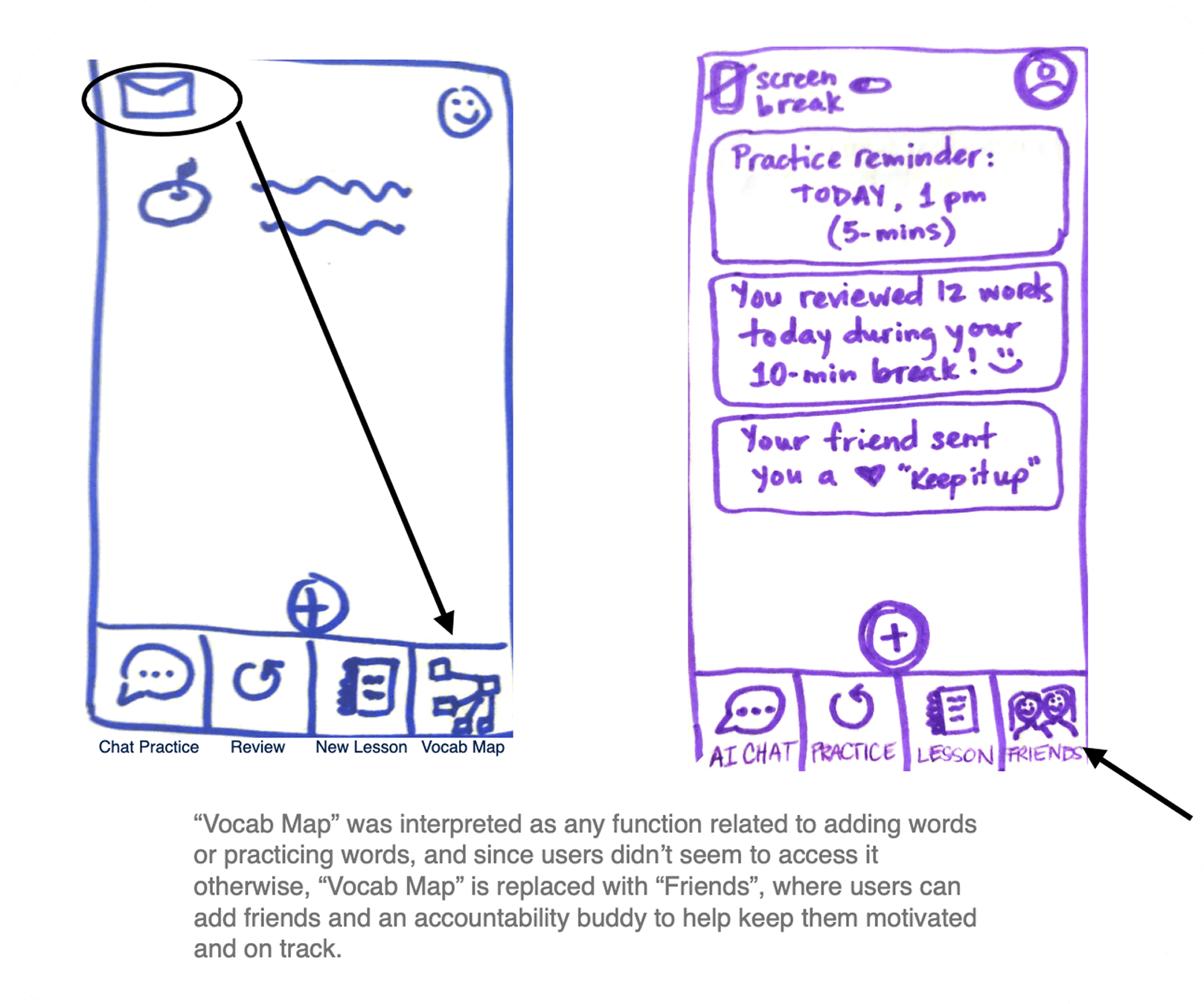 The bottomline was the diverse interpretations of “Vocab Map”, “Chat Practice”, and “Review” reduced task completion, namely: 1) adding a new word/flashcard; and 2) completing a review/practice.