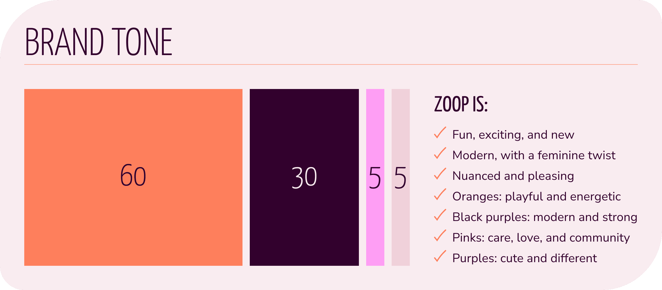 As my iterations began to gather consistencies, I documented them into a style guide (download here) as a reference for handover, a helpful communication tool, and for myself and other teammates to uphold our ZOOP brand consistently.