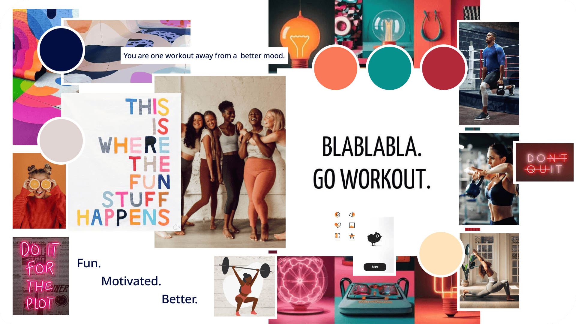 I zoomed in on the project brief to focus my moodboards. Variations of motivation, the desire to get fit, and committing to workouts, were starting points for my moodboards.