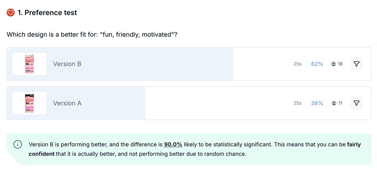I asked participants which design is a better fit for: “fun, friendly, motivated”? Twenty-nine responses later on Lyssna, the lighter version received 62% of votes, and the vote difference was 90% likely to be statistically significant.