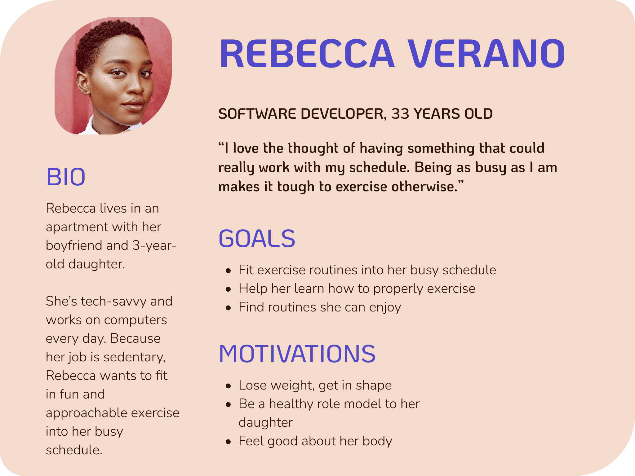 Younger to middle-aged professionals want a sustainable and approachable way to exercise, but they find themselves falling short on these goals from low motivation, packed schedules, and using routines that are too easy or hard for them.