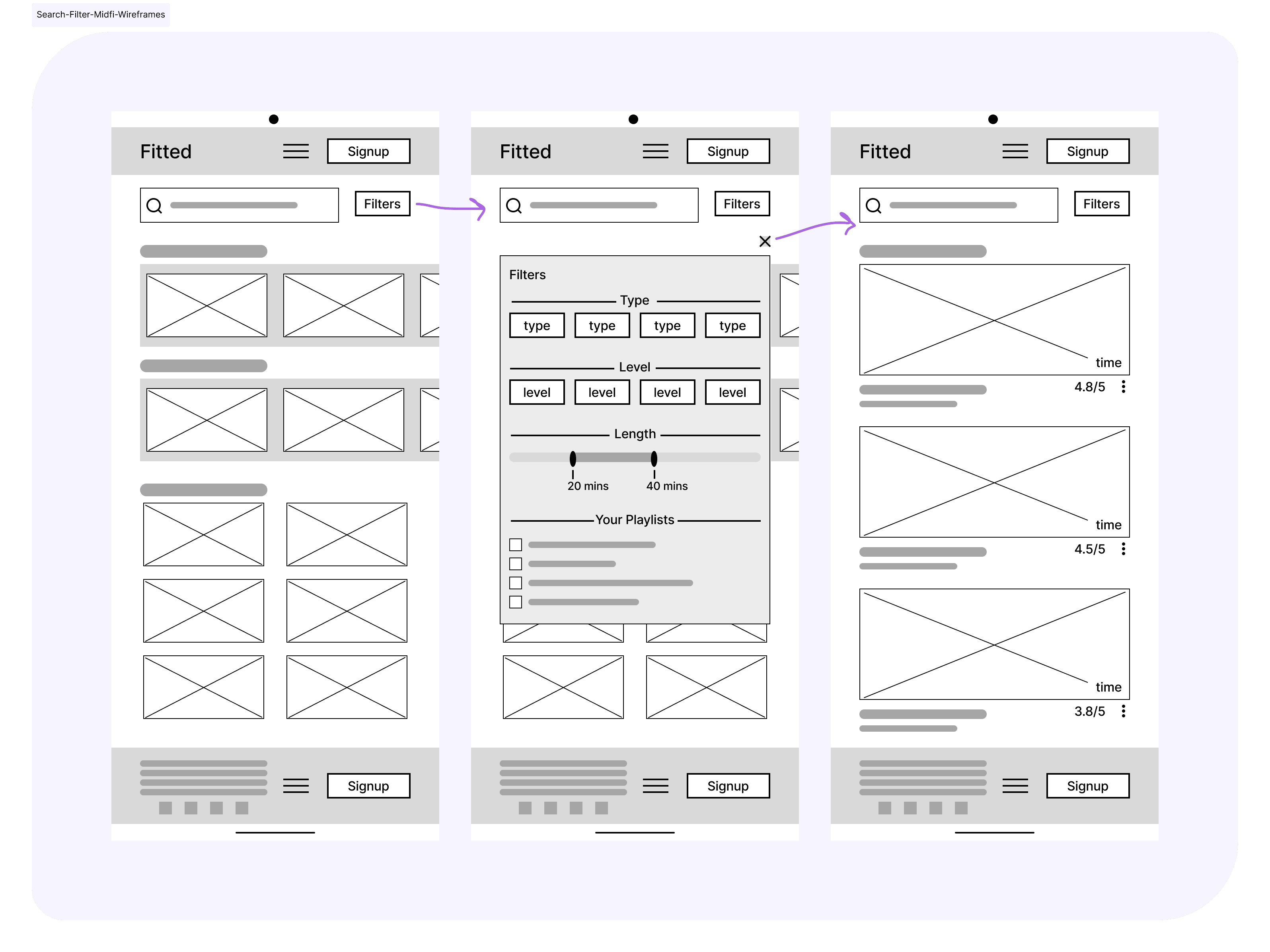 From the user stories, user flows were made, then rapid prototyping created quick low-fidelity and mid-fidelity wireframes.